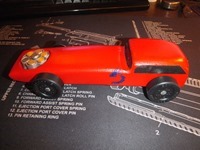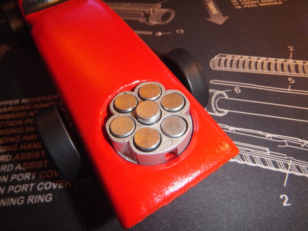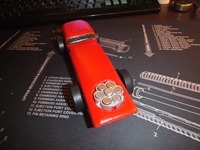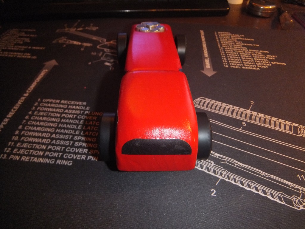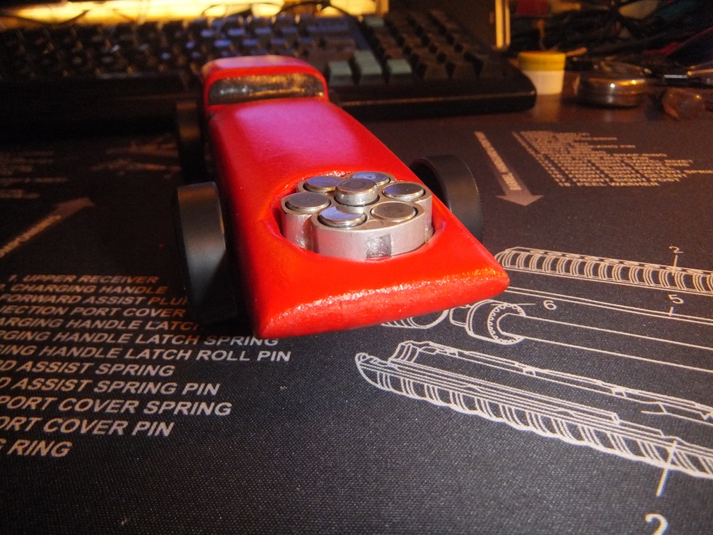 Here’s a few views of the completed car with clear coat on it. Yes I even painted the screw to match that holds on the weight kit. the weight kit was originally black, but I painted it silver and clear coated it as well. You can just remove the screw and adjust the weights as need be and I think it look like an engine in there, kinda cool I think.