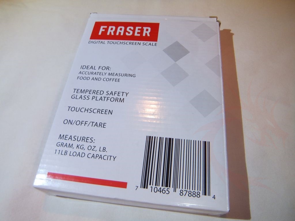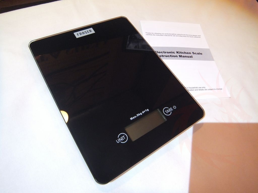 The scale is black in color and has the Fraser brand logo at the top. On the bottom of the front you’ll find the display and the touch controls on each side of it. The scale is small at 5.5" x 7" x .75" but should be find for most uses around the kitchen. It’s small but it’s heavier than it looks, it does feel very well made overall and for the price I’m impressed.