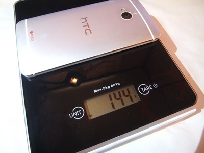 My HTC One M7 phone weighs in at 143 grams stock, but there is a sim card in it and a screen protector on it which pushes it over the 143g and since the scale doesn’t show the decimals it reads as 144g.