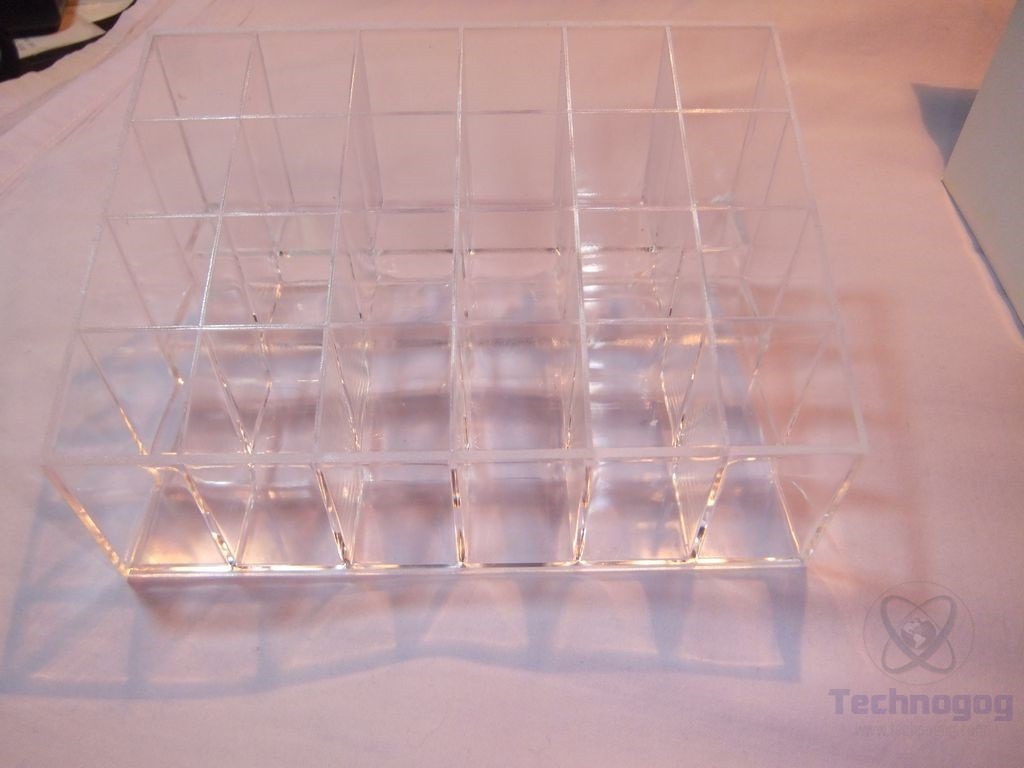 The stand is technically called the 24 Stand Transparent Plastic Trapezoid Makeup Cosmetic Organizer Display Stand Holder Box with the 24 meaning 24 spaces or squares in the holder. It’s clear plastic and it’s 5.62 x 3.74 x1.65 inches or about 14.3 x 9.5 x 4.2 cm in size. Yes it’s plain, but it doesn’t have to be fancy I guess. I’m a guy so I don’t have cosmetics, but I do have lots of stuff I could use this for as my desk is just full of little things rolling around.