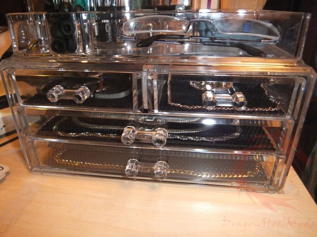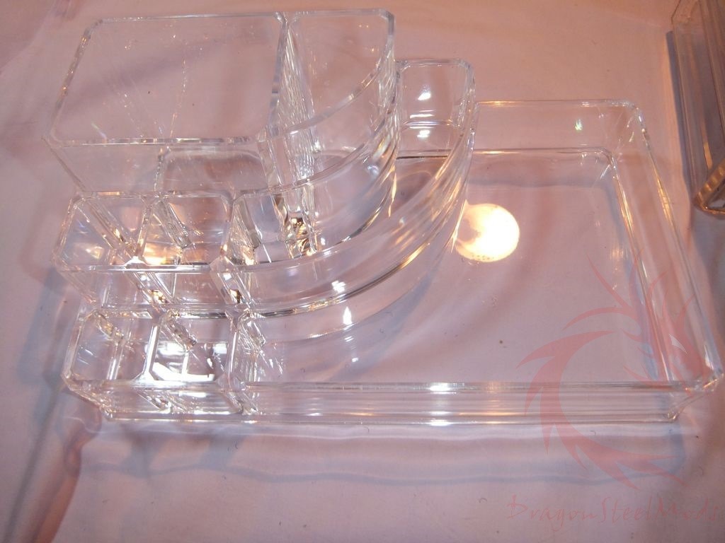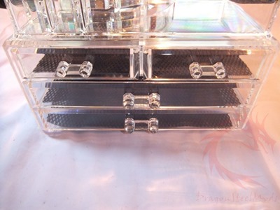 Up for review today I’ve got what is being sold as a makeup or cosmetics organizer box but it can be used for all sorts of things besides that. It’s a clear acrylic and it has two sections, a top with compartments of varying sizes and shapes and a bottom with drawers. It’s a decent product that looks nice and works fine…