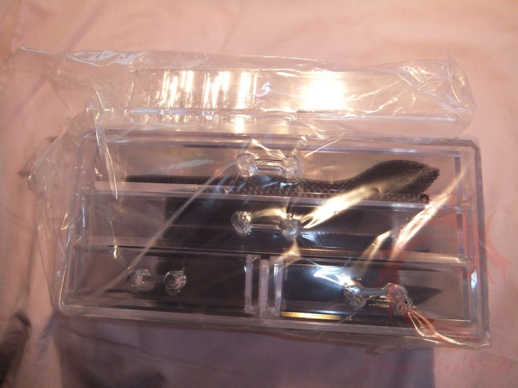 There are two pieces to the box, top and bottom. The bottom section is basically just a chest of drawers but the top section has all sort of compartments in varying sizes and shapes. It’s a hard acrylic material and it looks good and it seems well made overall.