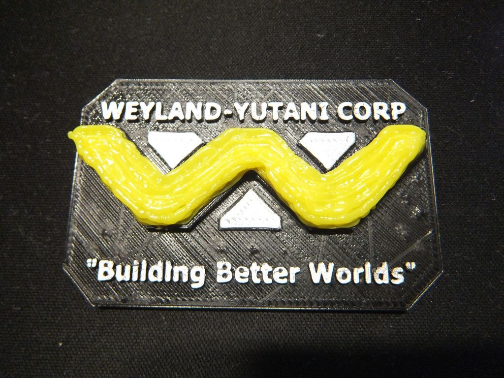 I 3D Printed a Weyland-Yutani badge. I printed it in black PLA filament and used a silver paint pen and I used a 3D pen fort he yellow buy I’m not happy with how it came out…