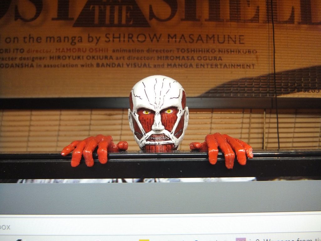 3D Printing 3D Printed Attack on Titan Colossal Titan Monitor Hanger by Kristofer Brozio • March 9, 2017 So I love Attack on Titan and I just had to print this monitor hanger or whatever you want to call it… I painted it, trying to make it look exactly like the one on the Anime, I got very close I think…